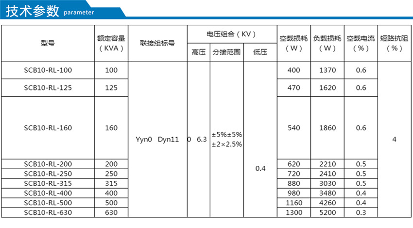 10KV級SCB10-RL-RL系列卷鐵心干式變壓器主要性能參數(shù):